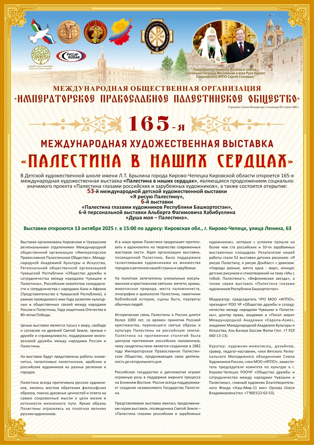 Выставки организованы: Кировским и Чувашским региональными отделениями Международной общественной организации «Императорское Православное Палестинское Общество», Международной Академией Культуры и Искусства, Региональной общественной организацией Чувашской Республики «Общество дружбы и сотрудничества между народами Чувашии и Палестины», Российским комитетом солидарности и сотрудничества с народами Азии и Африки (Представительство в Чувашской Республике).